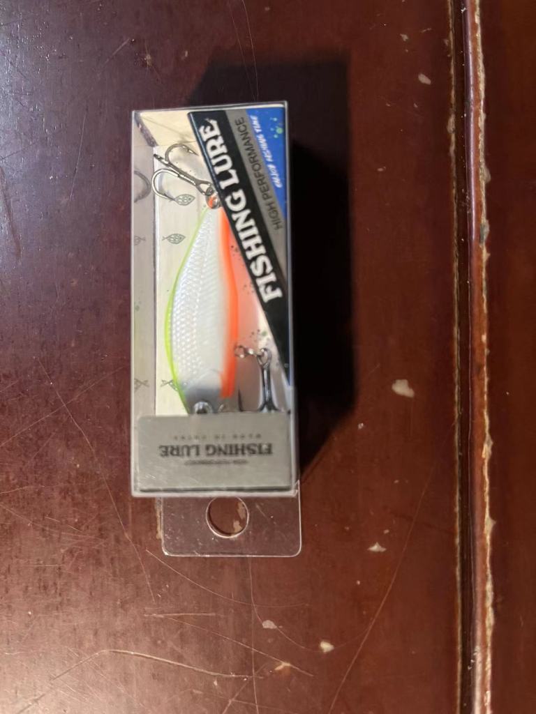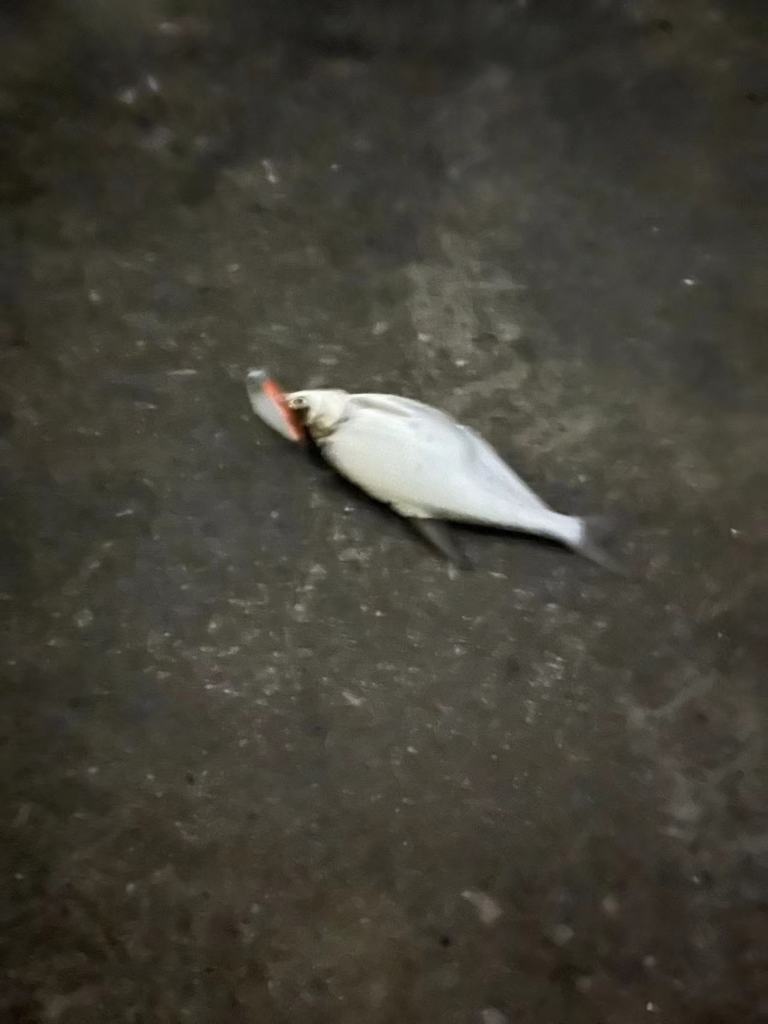 由于昨天晚口水面炸水,水面系,软虫都没口,今天准备了缓沉米诺和亮片。没想到米诺下去没几杆就中了以为迷你翘,上来赶紧拍照,这可是我人生中第一次路亚的鱼啊。